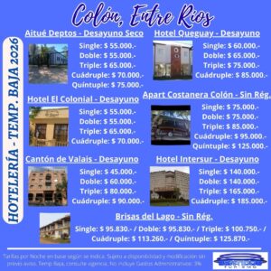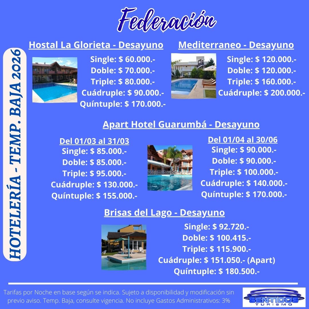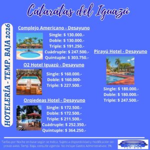 Hoteles TARIFARIO HOTELERIA HACER CLICK EN LINK  «Tarifarios Hoteleria y Excursiones» SUPER PROMO!!!  FIN DE SEMANA LARGO  TEMPORADA BAJA  Encontrá hoteles y alojamientos en los principales destinos de Argentina como Iguazú, Mendoza, Mar del Plata y Villa Carlos Paz.