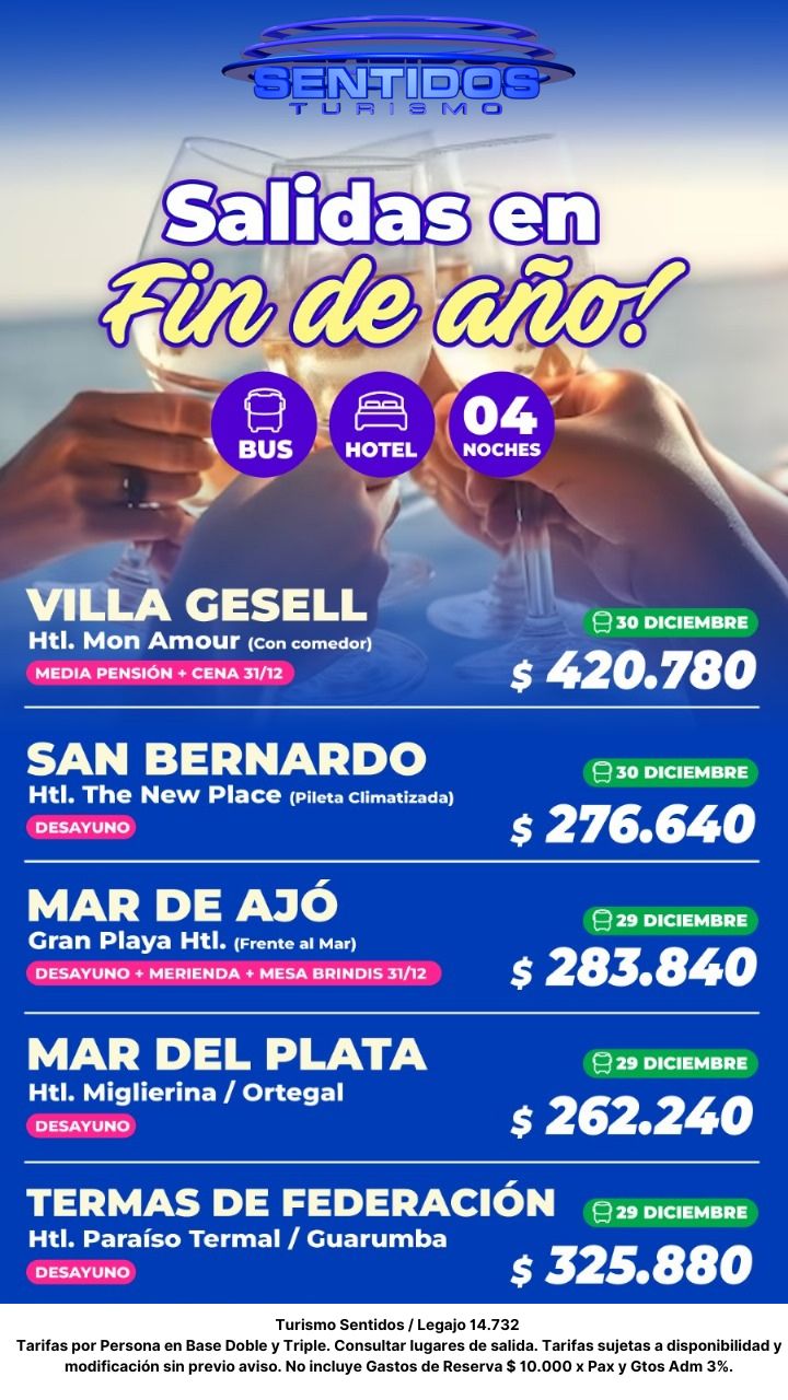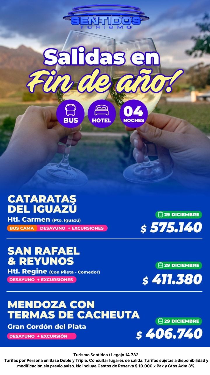Paquetes turísticos MINITURISMO NAVIDAD Y FIN DE AÑO VERANO 2026 «Haga Click en Link para Abrir archivo con todas las salidas» Salidas en Bus Verano 2026 TEMPORADA BAJA En Turismo Sentidos EVT ofrecemos paquetes turísticos nacionales e internacionales ✈️. Viajá a destinos como Iguazú, Mendoza, Mar del Plata, Villa Carlos Paz, Ushuaia y más, con beneficios exclusivos.